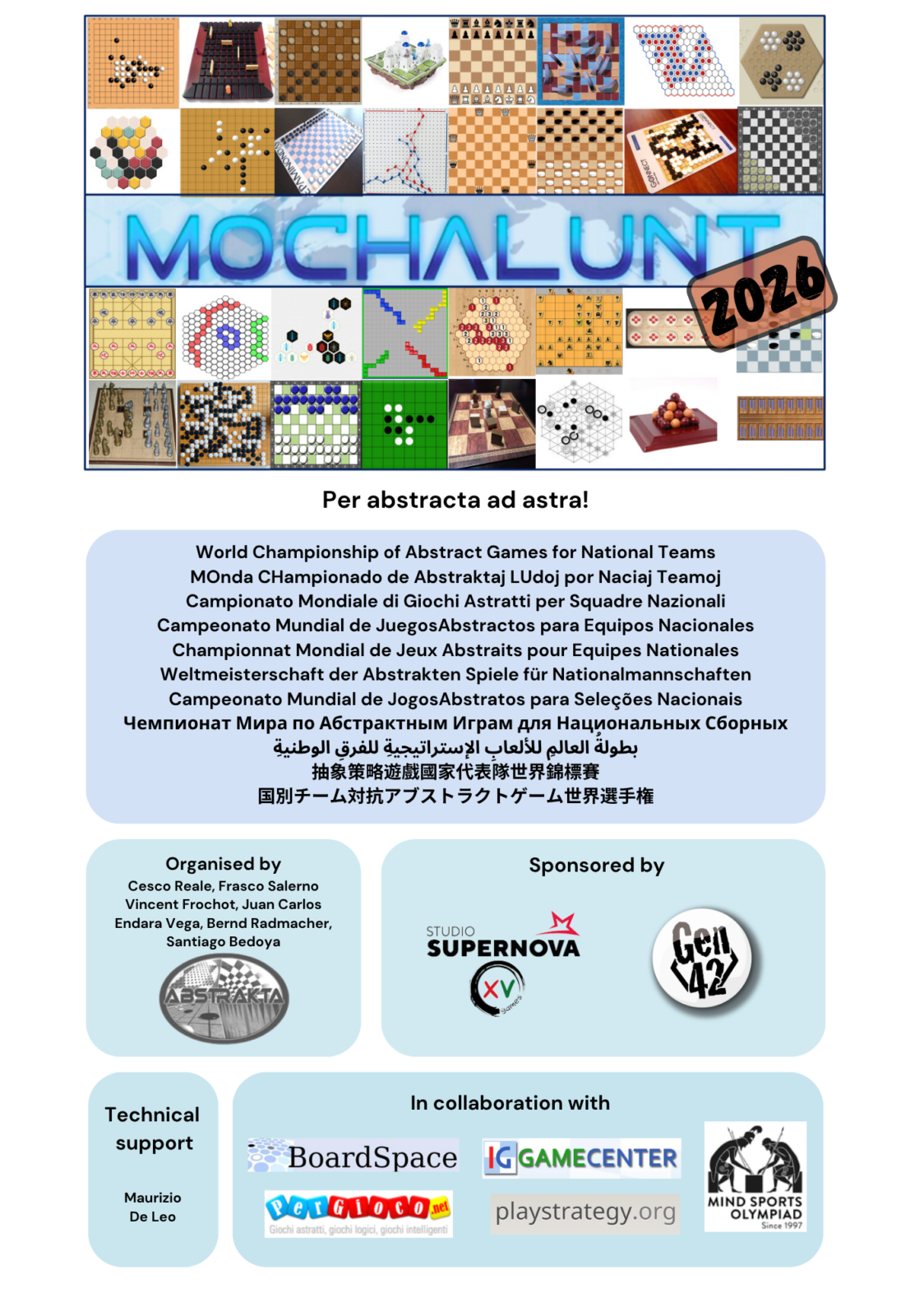 (Mochalunt is an acronym in Esperanto for MOnda CHampionado de Abstraktaj LUdoj por Naciaj Teamoj, meaning World Championship of Abstract Games for National Teams). We are looking forward to an exciting new edition!